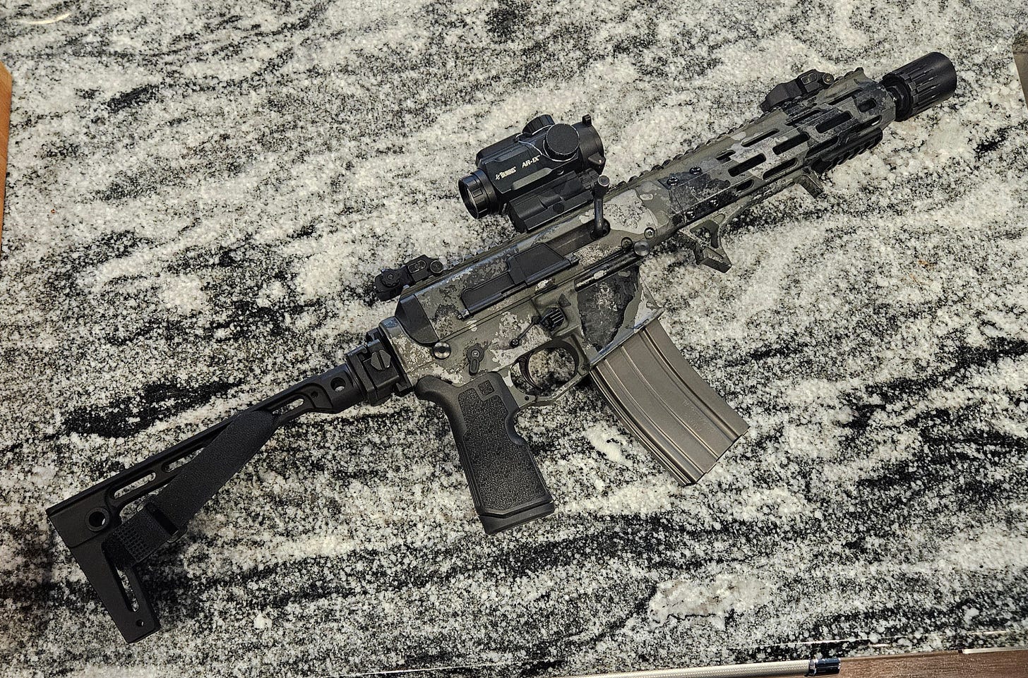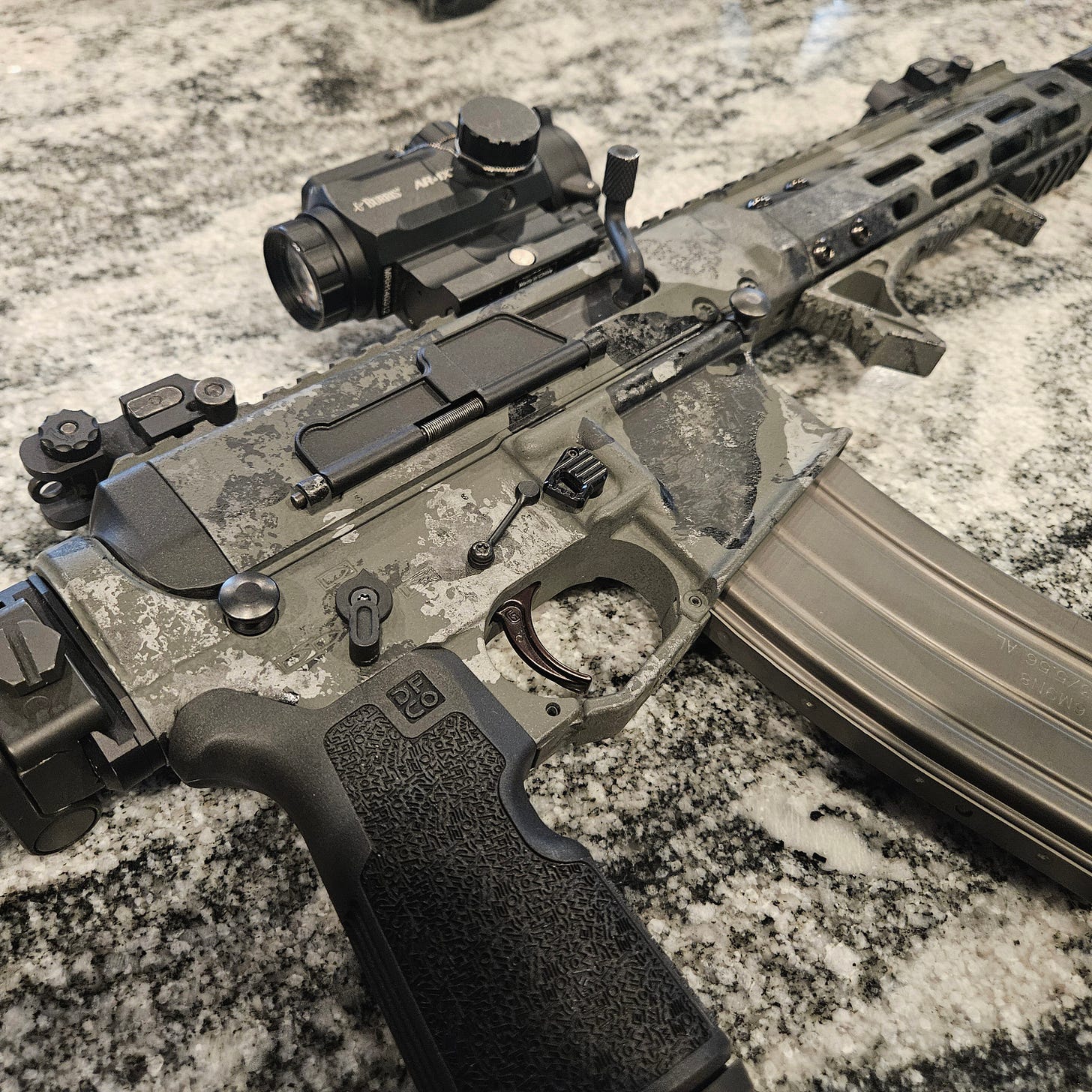 Meta description: A BRN-180 short-stroke piston rebuild gets a Geissele SSP trigger and a rugged Brownells Alumahyde DIY sponge-camo finish—prep, cure tricks, and an urban-modern colorway.